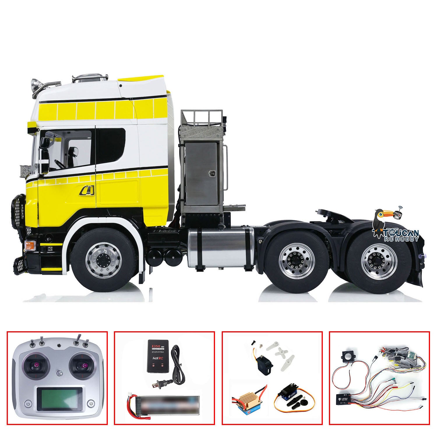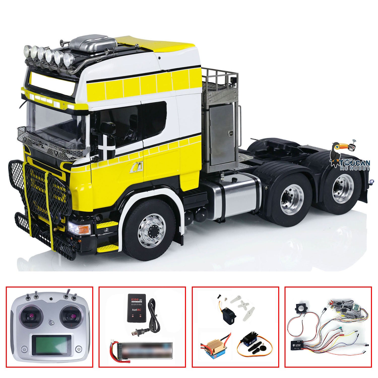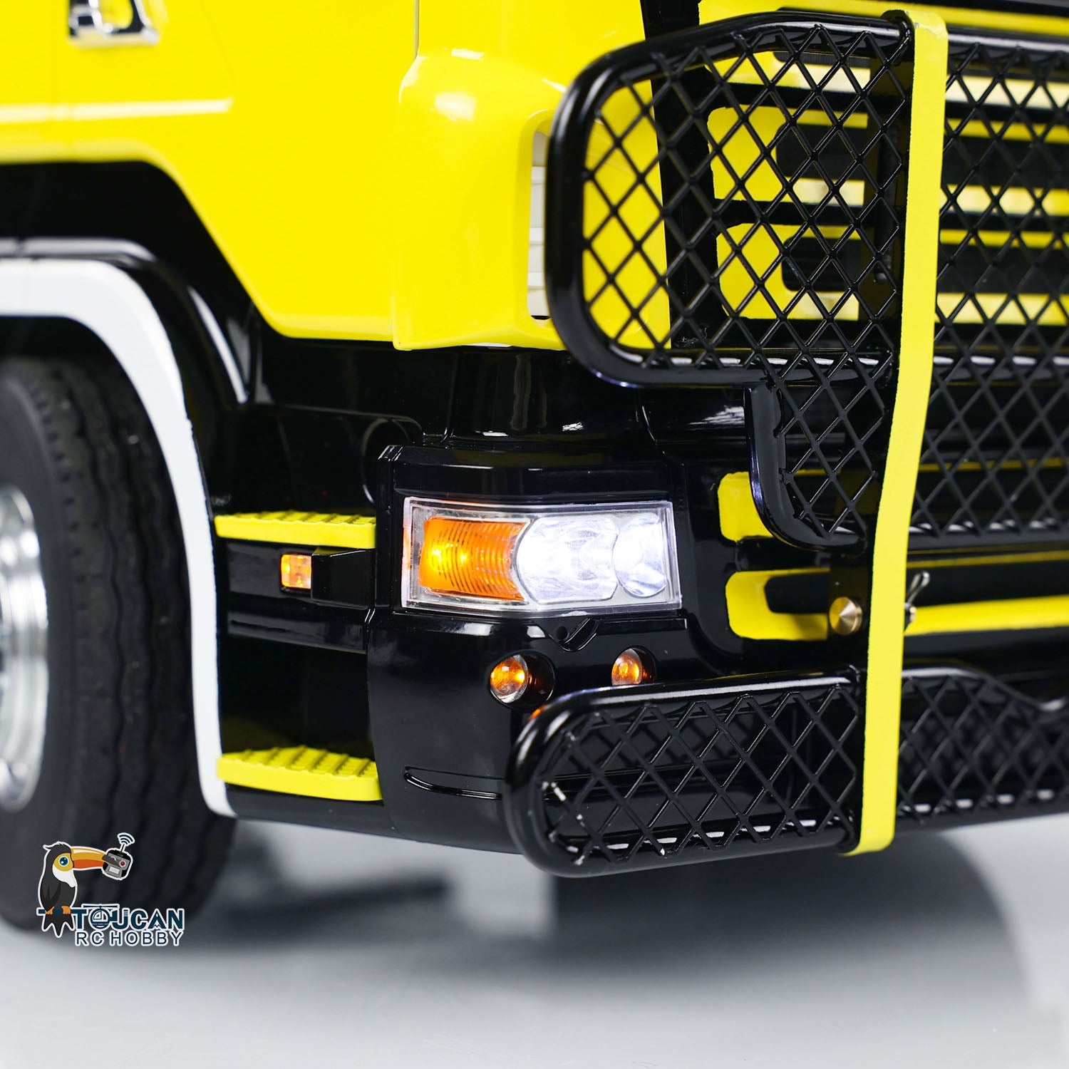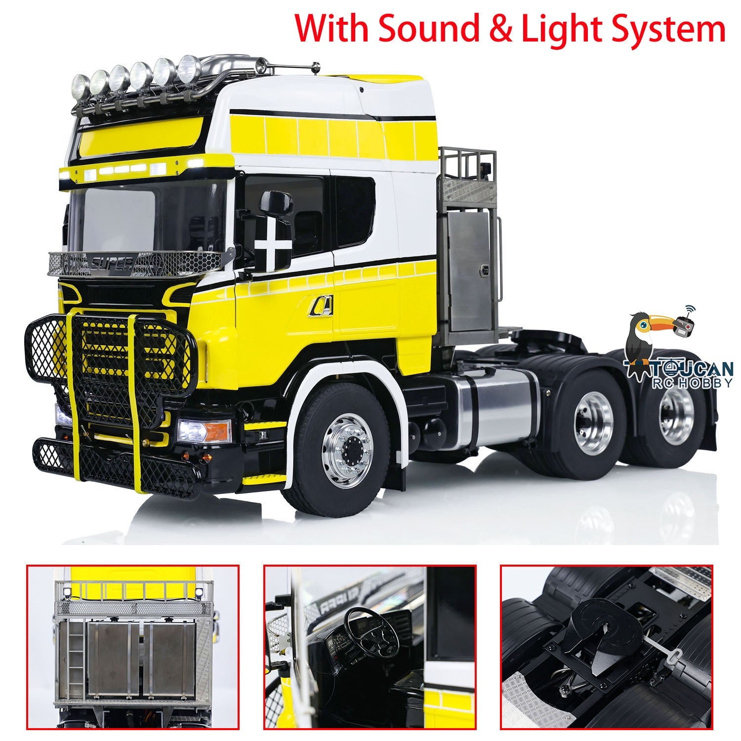 2. Beleuchtungs- und Soundsystem: Es ist mit einem umfassenden Beleuchtungssystem ausgestattet, einschließlich Scheinwerfern, Rücklichtern und Blinklichtern. Darüber hinaus verfügt es über ein Soundsystem, um den Realismus Ihres RC-Truck-Erlebnisses zu verbessern.