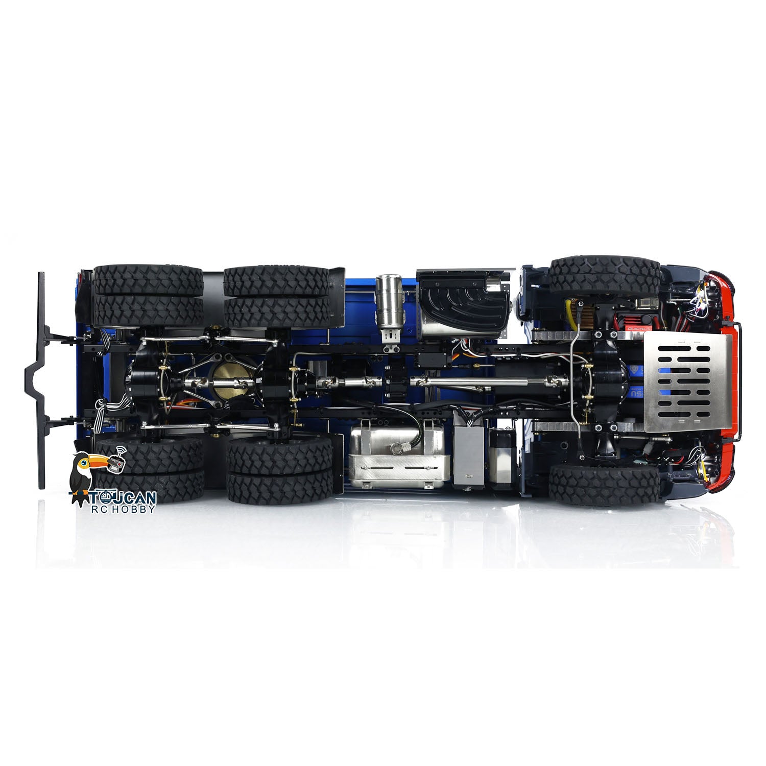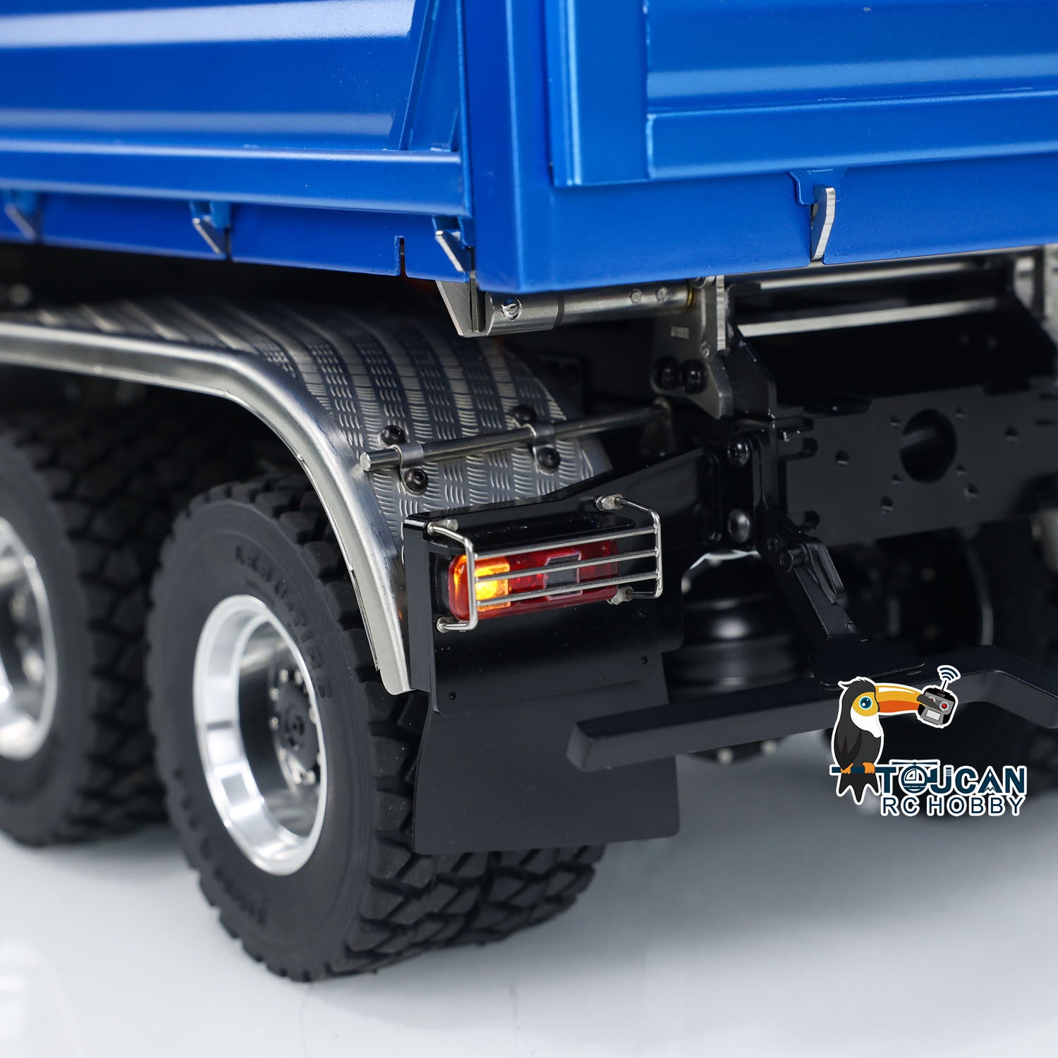 7. Fernbedienung: Der RC-Hydraulik-Muldenkipper wird über eine Fernbedienung gesteuert, die eine präzise Kontrolle über die Bewegungen des Fahrzeugs bietet und so das Fahren und Bedienen erleichtert.