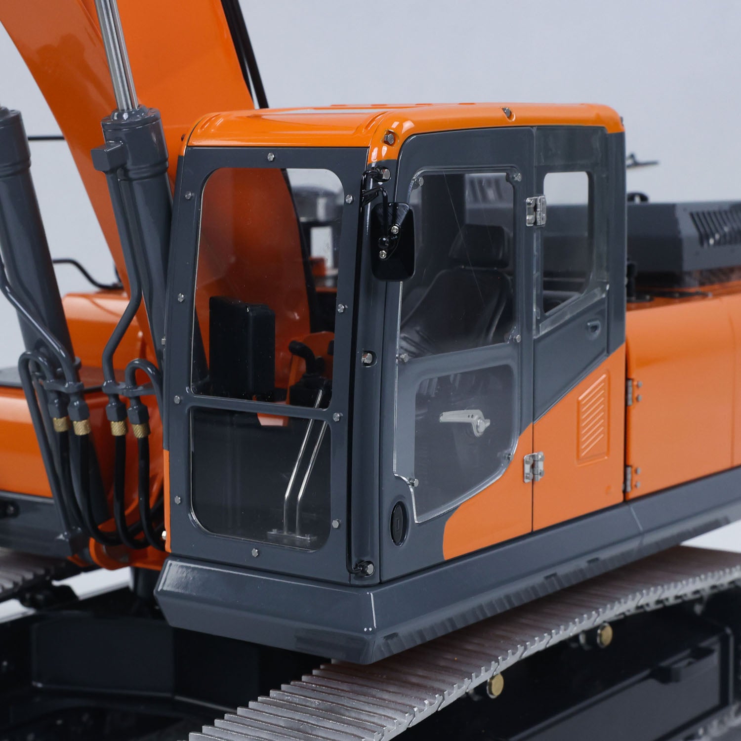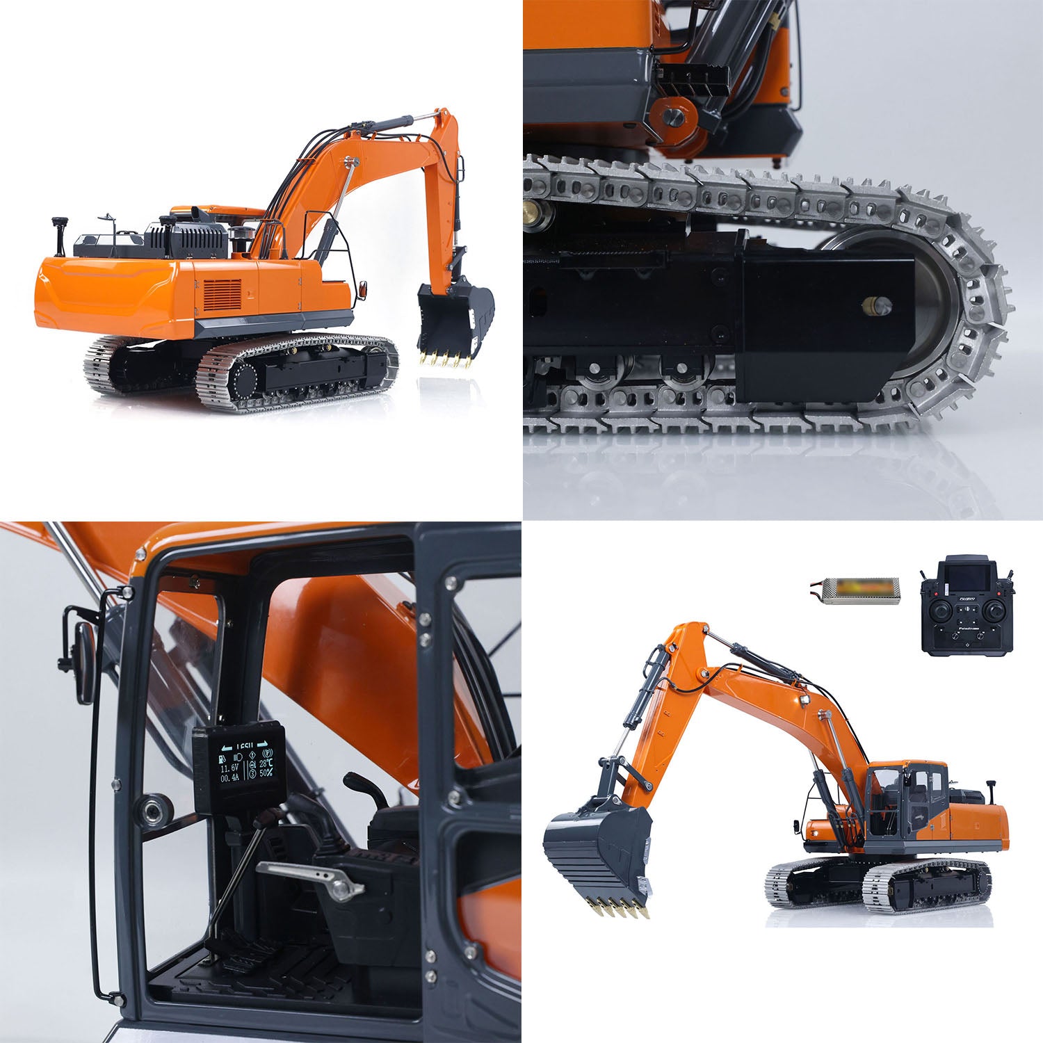 3. The whole excavator adopts a modular design, with 90% of the metal material, and the oil circuit system is composed of 80% copper, using multiple processes such as CNC, sheet metal, laser welding, etching, bending and mold opening. The all-metal traveling crawler and traveling frame have a solid structure and high detail restoration. There are stainless steel simulated foot pedal decorative parts at the front and rear of the traveling frame. In terms of power system, the drive adopts a brushed motor with a planetary reduction structure, which has the performance of high efficiency, low heat generation, low speed and high torque, making the whole machine run more smoothly and stably on complex terrain, and bringing better operating experience and stable output for model operation.
