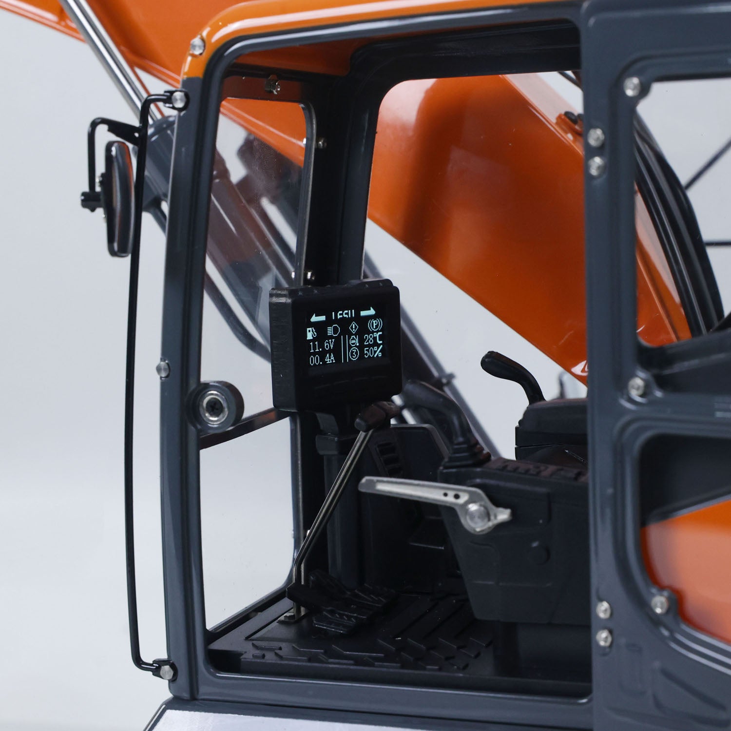 2. The DX350LC excavator is equipped with a highly simulated seat made of ABS material, with excellent texture; a one-button power switch is set under the armrest on the left side of the seat for quick operation, and it is also equipped with a simulated LCD display that can monitor key parameters such as voltage, current and temperature in real time. The overall design not only highly restores the operating environment of real construction machinery, but also enhances the professionalism and ornamental value of the model.
