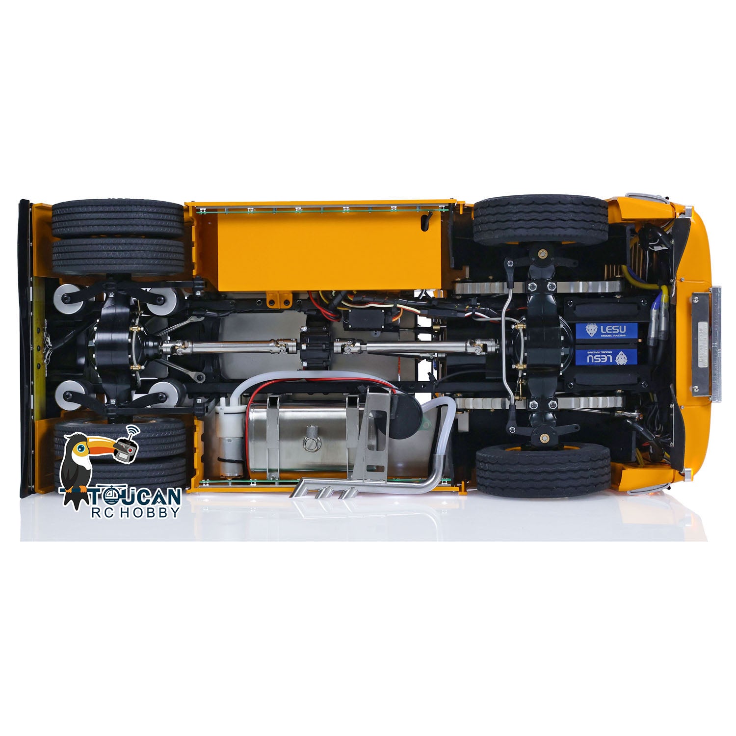 1. Metallchassis, Achsen, Antriebswellen und Naben: Das RC-Sattelzugmodell verfügt über ein robustes LESU-Metallchassis, das Haltbarkeit und Realismus verbessert. Alle wesentlichen Komponenten wie Achsen, Antriebswellen und Radnaben sind aus hochwertigem Metall gefertigt, um zusätzliche Festigkeit zu gewährleisten.
