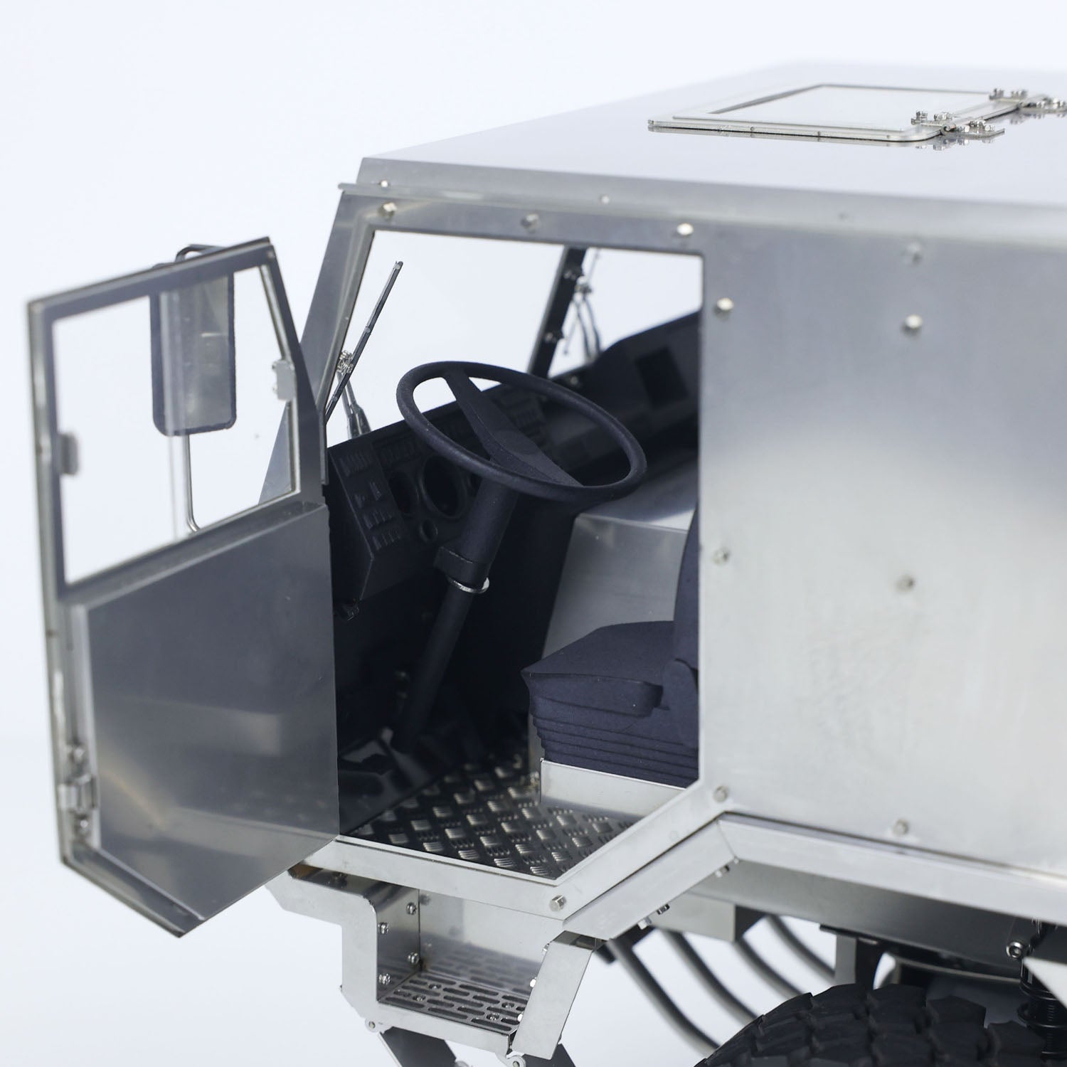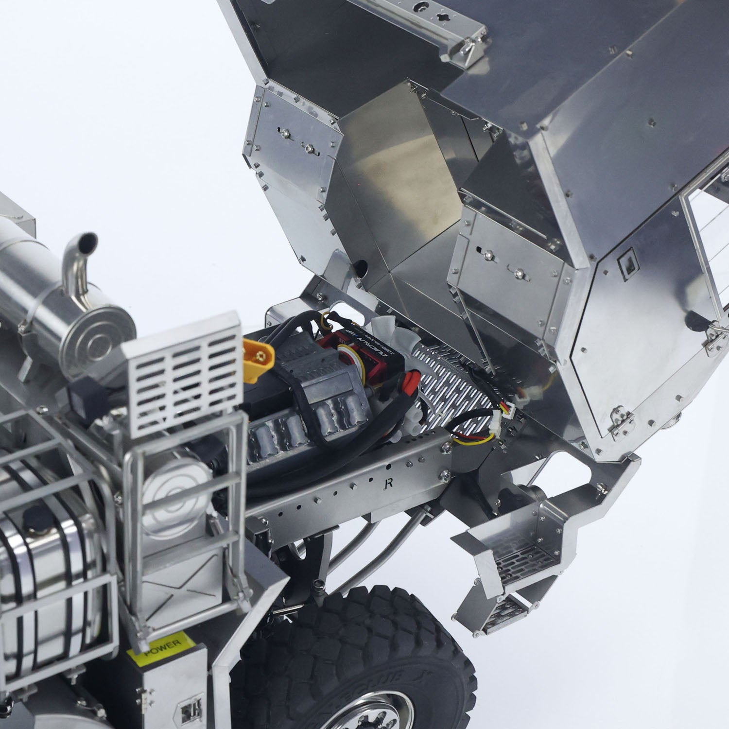 This T815 military truck model comes with a 3-speed transmission, wheel reduction gears, central transfer case with differential lock, and 4 axles independent differential locks.