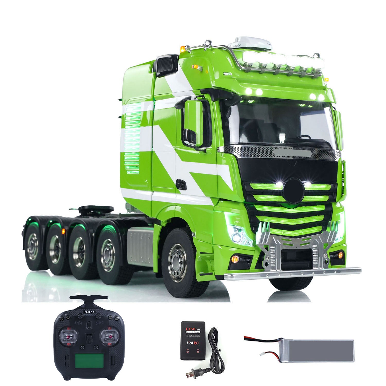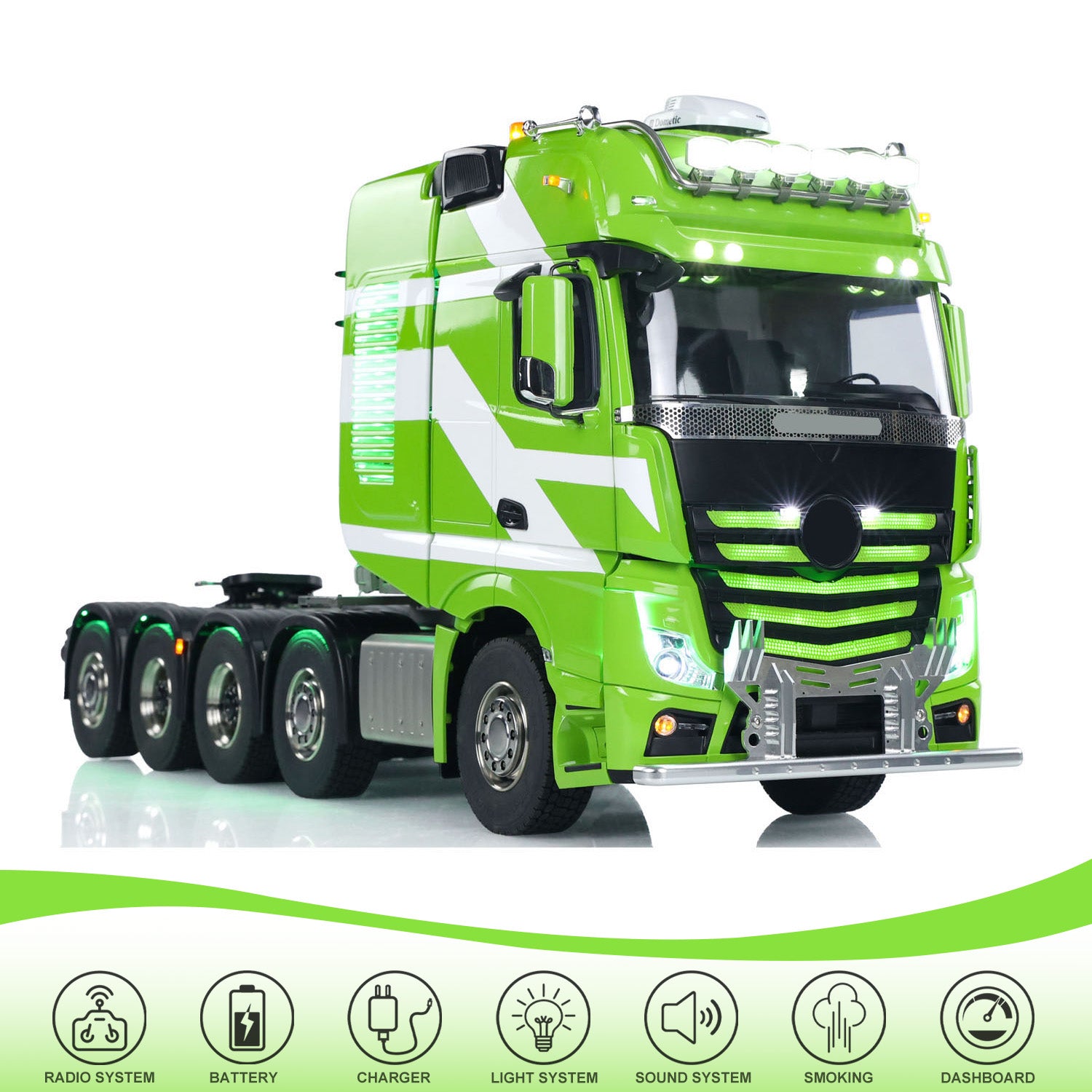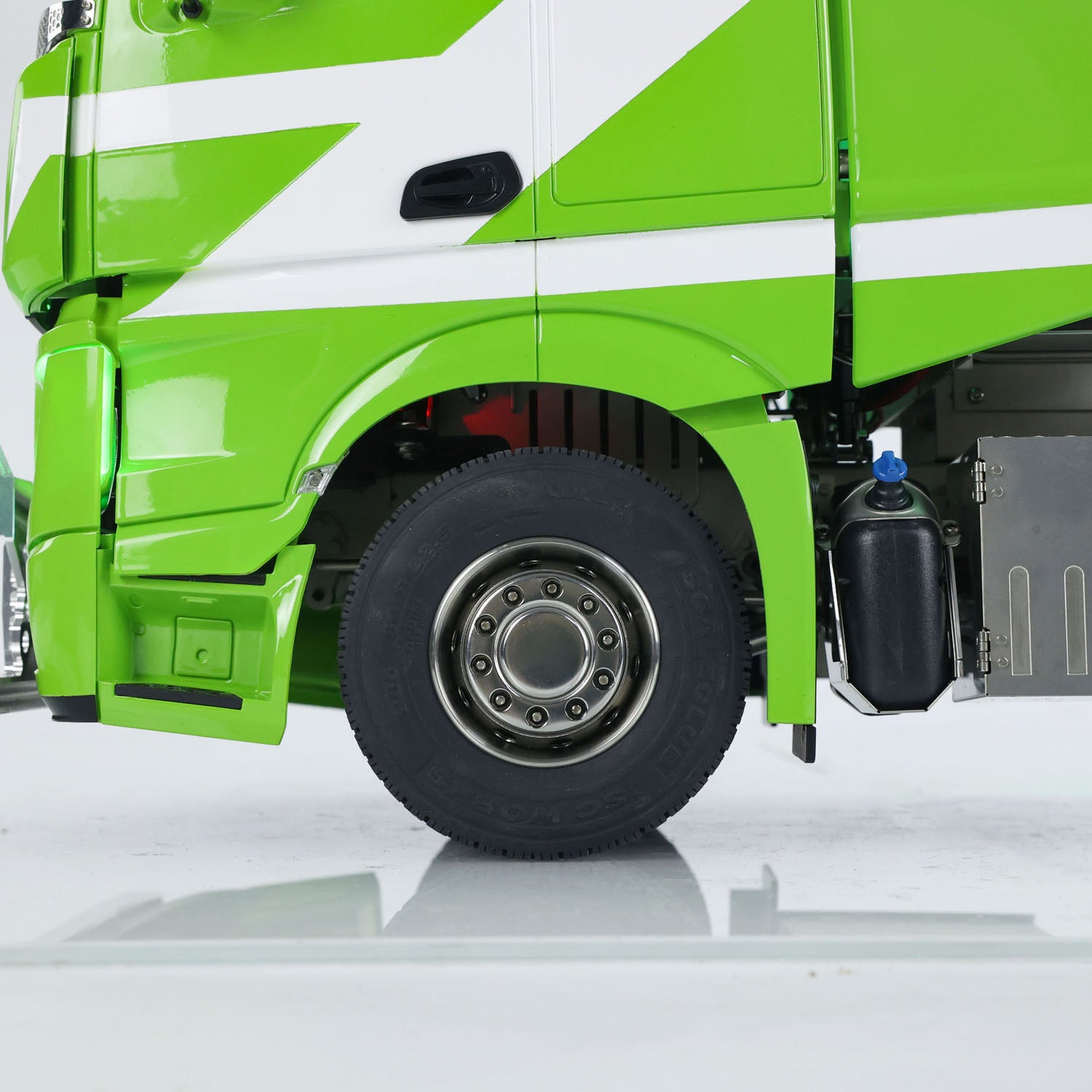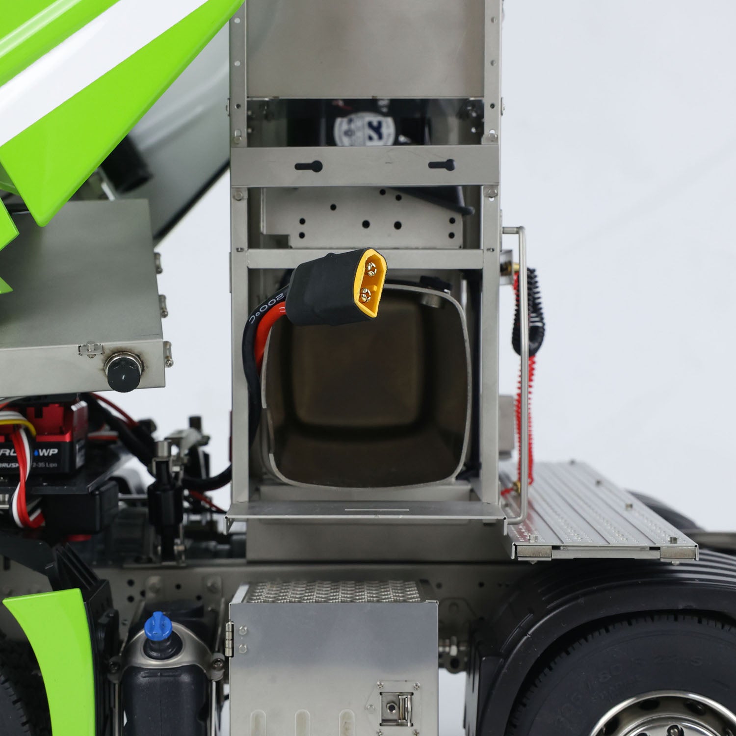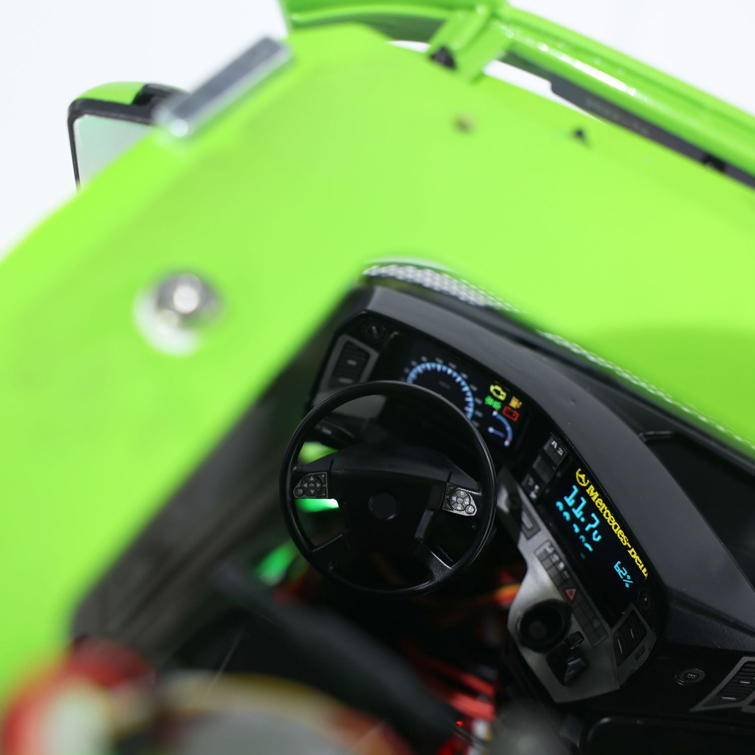 6. Cabin: The striking combination of green and white with exquisite paintwork catches the eye! The paint coating is smooth and fine without any graininess, and you can customize it in any color you desire. The cabin includes a multimedia screen and an instrument panel screen, making this truck even closer to a real one! You can intuitively see the vehicle brand, startup time, temperature, voltage, battery level, and the movement of the speed needle. As the throttle lever is moved, the RPM and speed needles will rotate accordingly.