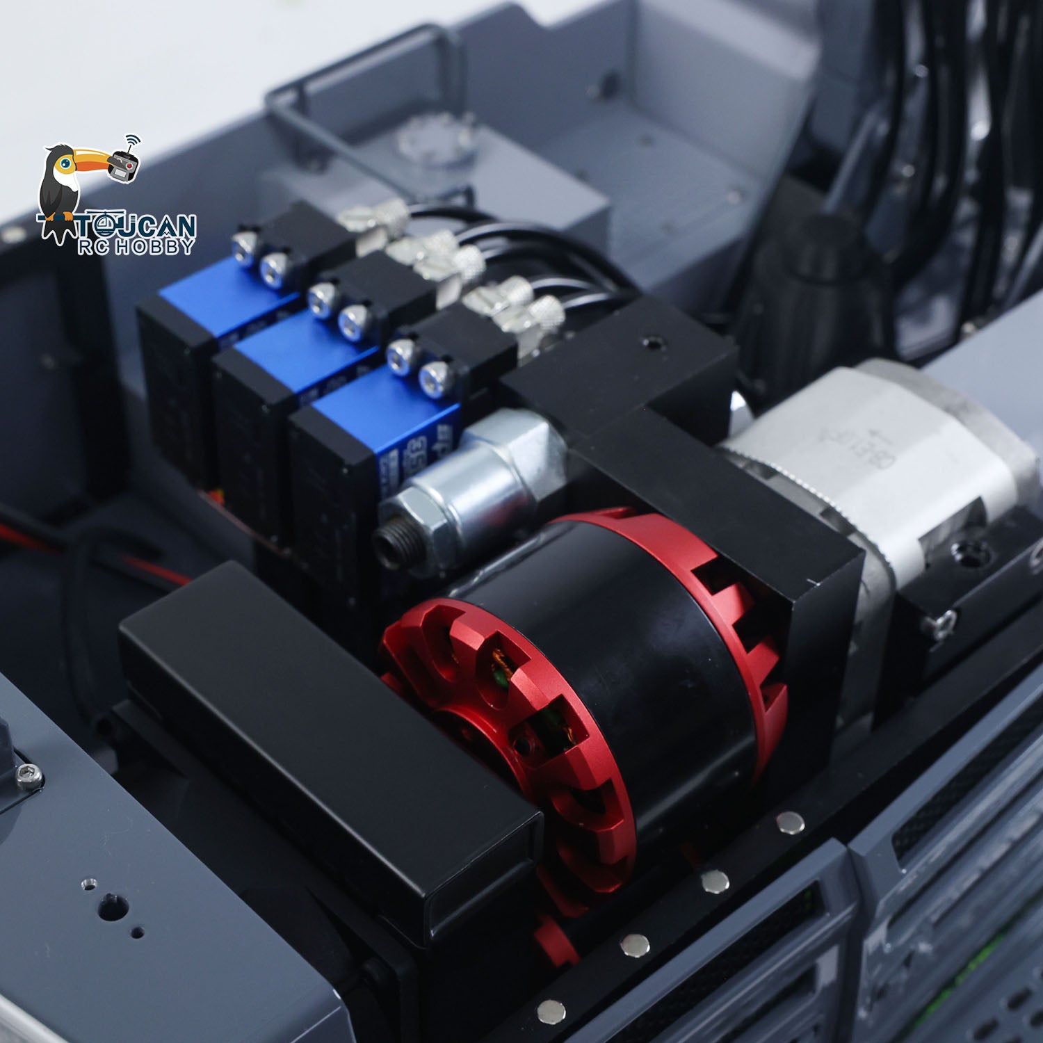 3. The hydraulic system uses a dual-pump hydraulic system, equipped with 2pcs 1.0L pumps, 2pcs 6354 sensor brushless motors, 2pcs 80A brushless ESCs, 6000-rpm cooling fans, visual oil filter accessories, etc. The bucket cylinder diameter of the boom and arm is 20MM, and the dual-pump hydraulic system can quickly inject hydraulic oil into this large-diameter cylinder. This dual-pump hydraulic system also uses a 6-way reversing valve with an overflow valve, among which 3 ways can be used with additional purchased upgrade parts. 6 quick-connect oil nozzles for upgraded accessories have been connected, and a manual quick release for the bucket is configured to facilitate players to replace different upgraded accessories.?