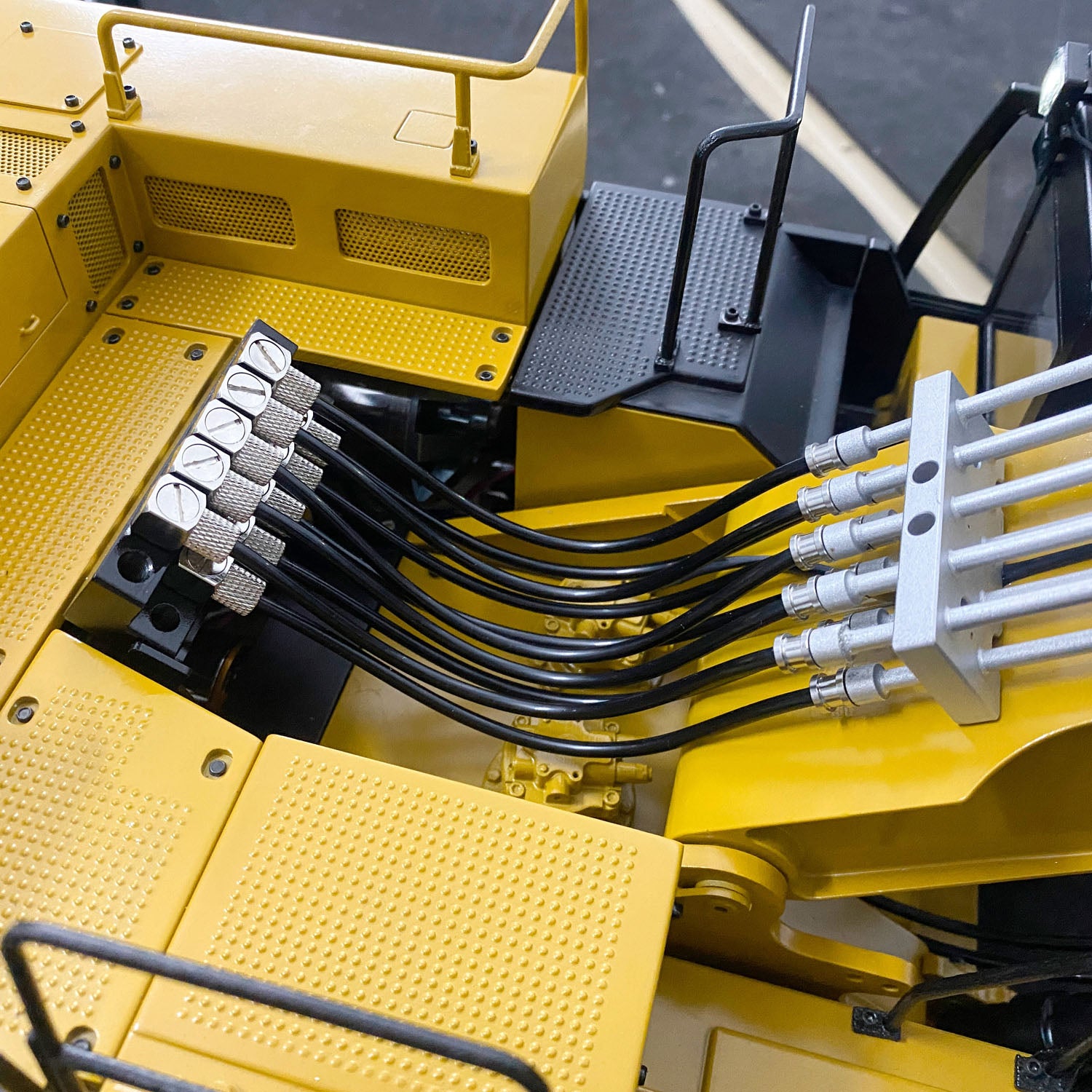 2, This demolition excavator is equipped with a semi-automatic quick removable seat, metal 5 channels reversing valve, and metal hydraulic oil pump with a 5055 brushless motor, also it comes with a light system and sound system, the sound system completely imitates the real excavator!