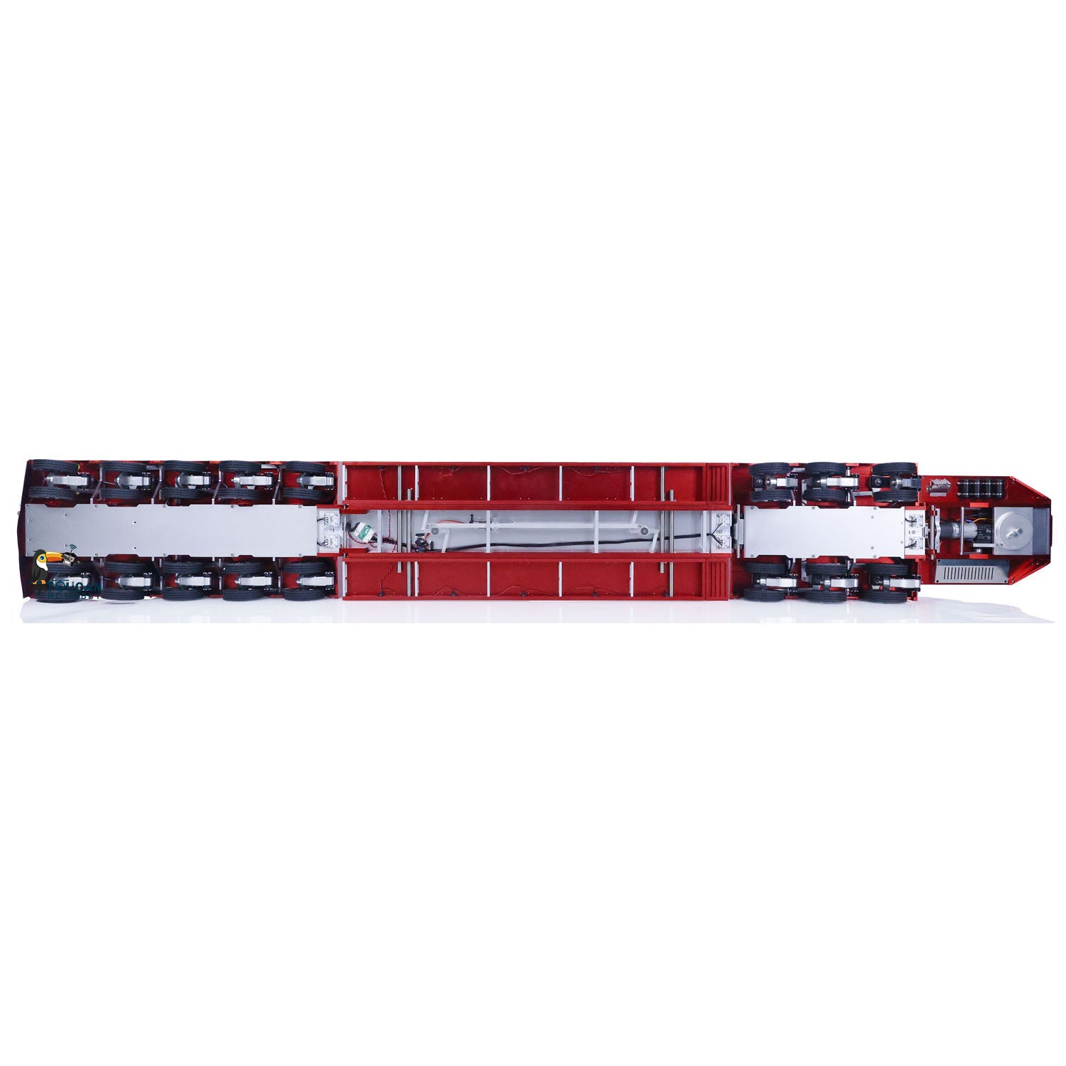 7. It is recommended to use three 2s (7.4v) 1800-3000mAh 25c lithium batteries (with JST connectors) for the gooseneck, three-axle trailer, and five-axle trailer (Batteries are not included). The dimensions of the battery compartments are: gooseneck - 80*50*50mm, three-axle trailer - 70*50*10mm, five-axle trailer - 80*50*20mm.