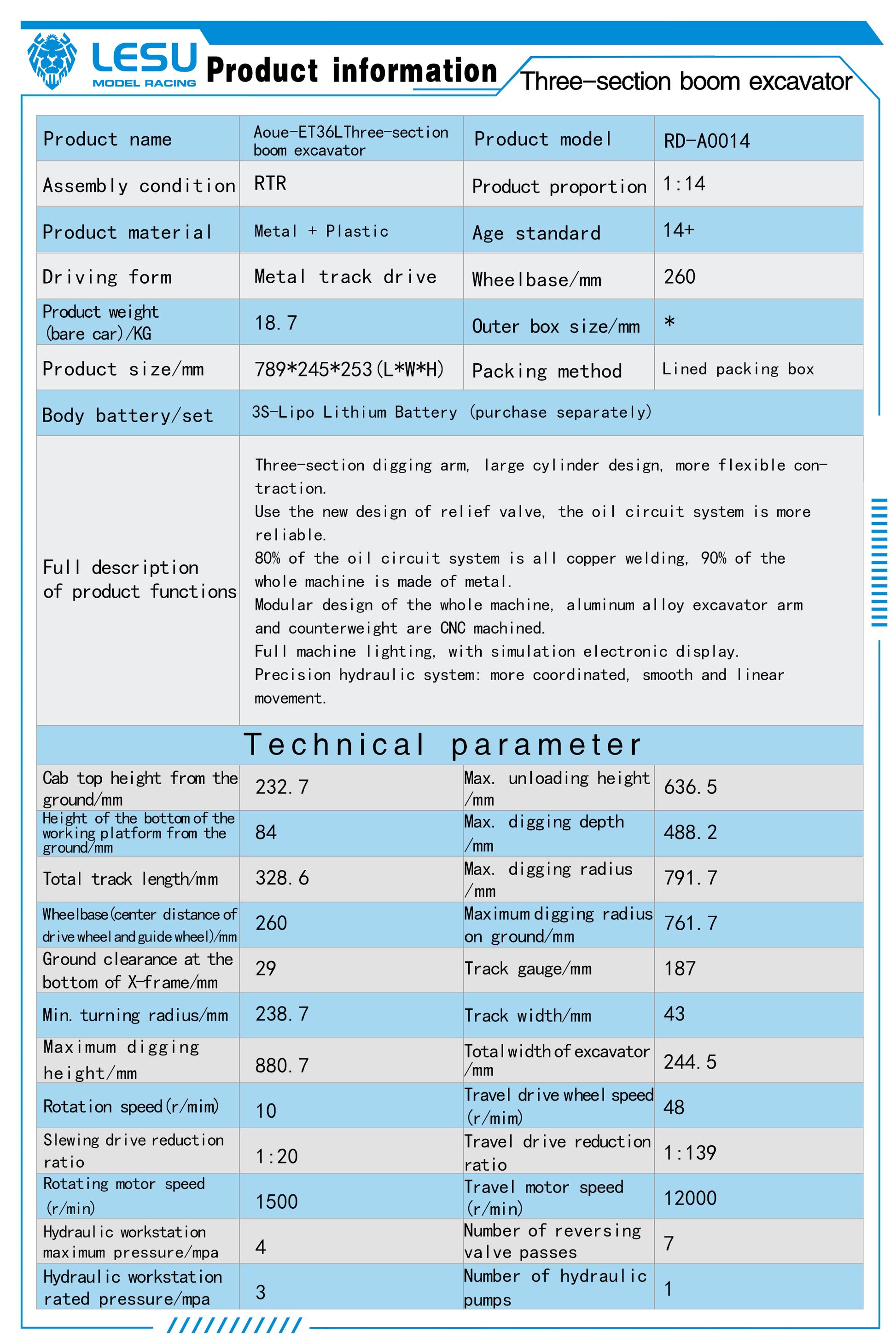 LESU 1/14 RC Hydraulic Excavator ET36L 3-boom Digger