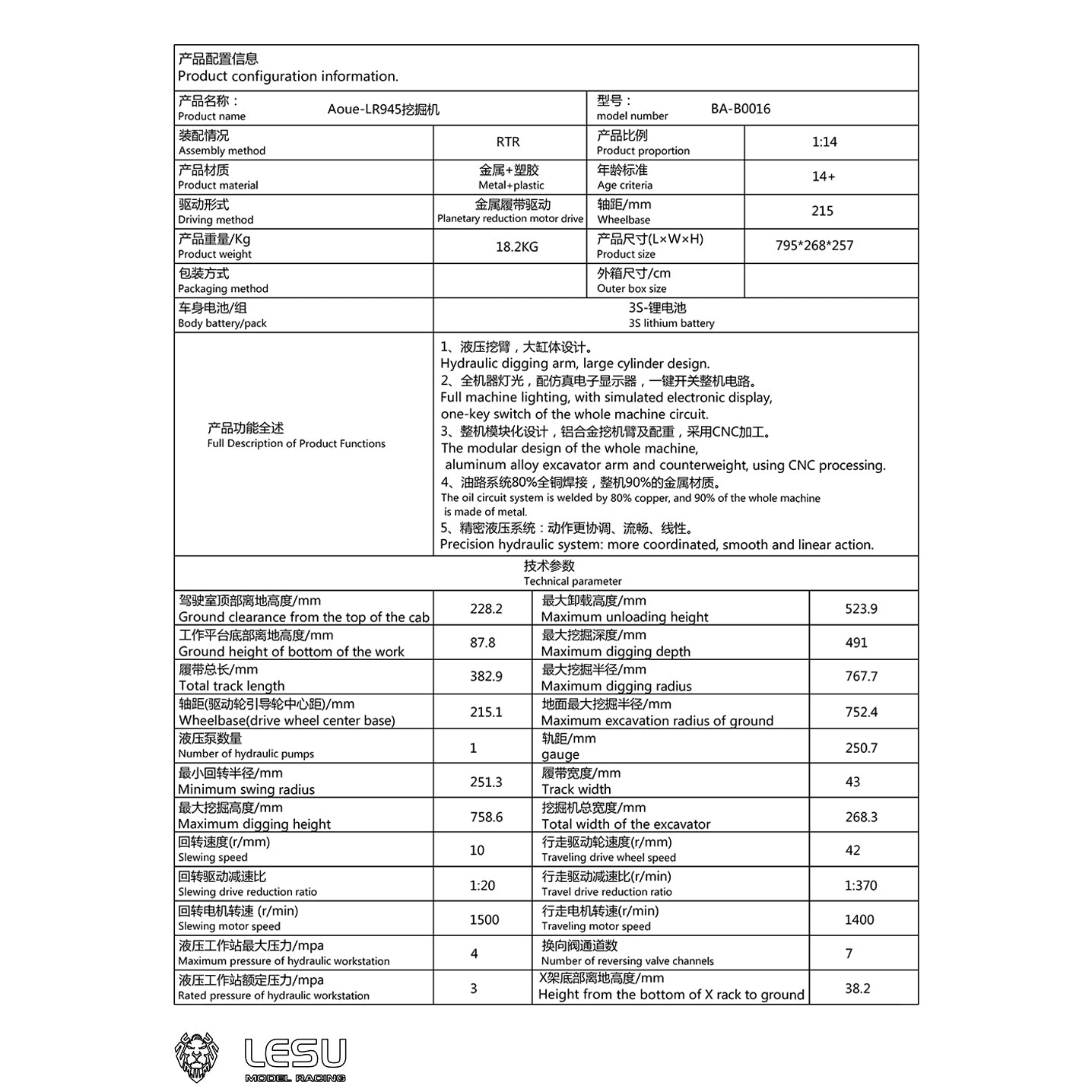 LESU 1:14 Scale Aoue LR945 KIT RC Hydraulic Excavator B0016